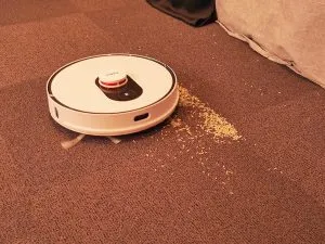 Robot automatycznie porusza się po pomieszczeniu w trybie czyszczenia, skutecznie usuwając kurz i zabrudzenia dzięki systemowi antykolizyjnemu.